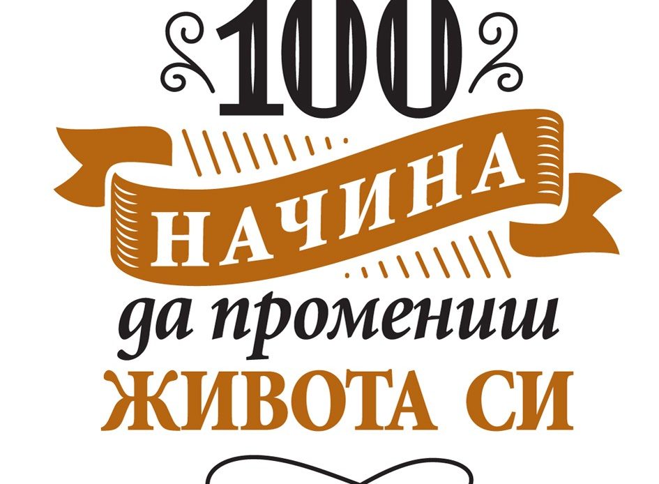 Но един ден в офиса ни дойде нова пратка за “Аз чета” и, разбира се, я отворих. Пред мен се появи заглавието “100 начина да промените живота си” (изд. „AMG Publishing“). Странното беше, че не ми направи лошо впечатление, защото корицата е модерна, типографска и семпла, и най-важното – на нея няма море, планина, слънце и други подобни символични картинки, извадени от Google. Реших, че в края на годината може да я прегледам, все пак е време за целеполагане. Макар и да не искам да променям живота си изцяло, има някакви неща, които държа да направя или да спра да правя, та затова започнах да я чета.