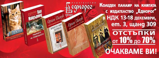 Акцентите в селекцията на „Еднорог” за Коледния панаир на книгата 2016 са в разнообразни жанрове и включват както заглавия на най-популярните и обичани автори на издателството, така и силни предложения от нови за българския пазар писатели. На щанд 309, разположен на 3-тия етаж, читателите ще могат да се възползват от разнообразни празнични намаления и оферти, направени специално за Панаира.