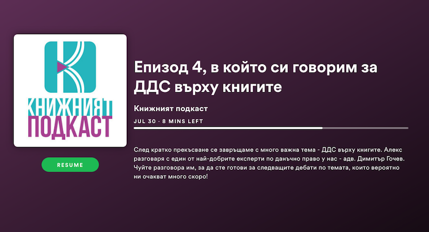Всички ние от екипа на „Аз чета“ се надяваме дебатът за ДДС върху книгите все пак да бъде подновен и най-накрая да бъде взето решение, което да е от полза и за читателите, и за издателите, и за всички останали участници в процеса, а ако този епизод ви е харесал, можете да се абонирате за „Книжният подкаст“ в две от най-големите подкаст платформи – Spotify и Anchor.