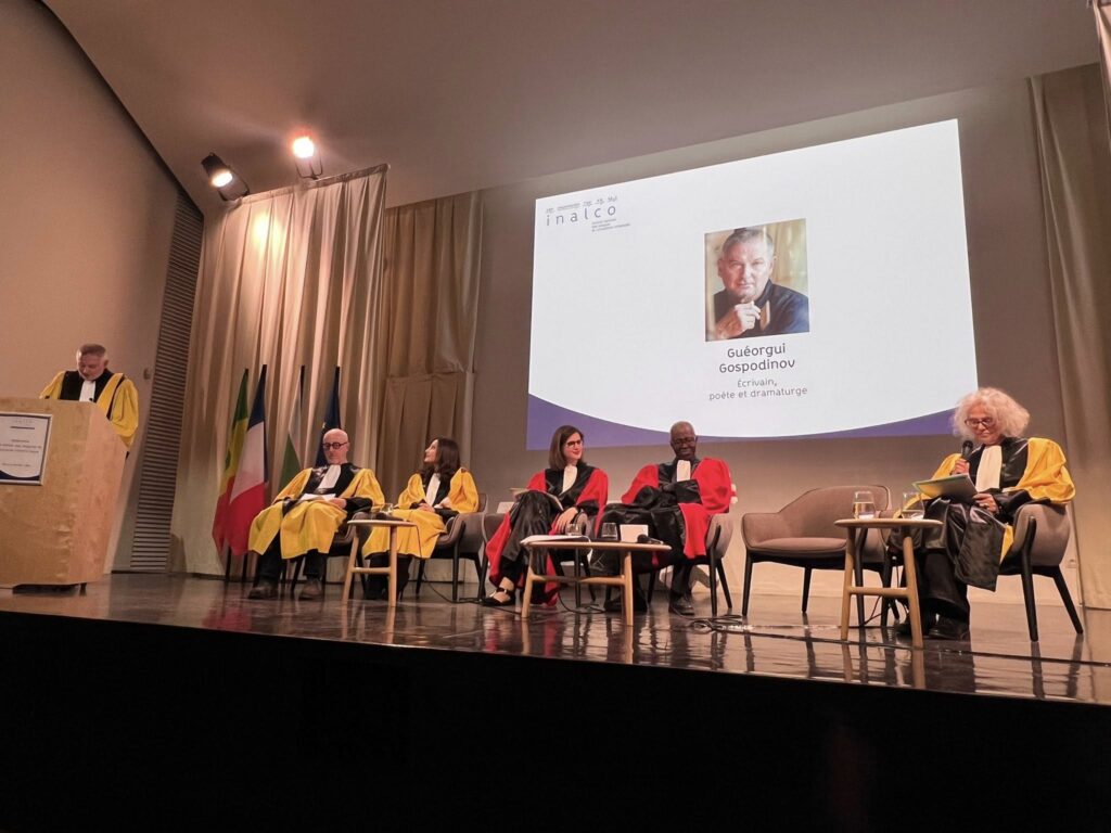 Българският писател Георги Господинов е удостоен с титлата Доктор хонорис кауза на Националния институт за източни езици и цивилизации (INALCO) в Париж, съобщиха от издателство „Жанет 45“. Висшето учебно заведение, основано през 1669 г. (преди 357 години), е единствено по рода си в света с това, че предлага специализация по 104 езика от Централна и Източна Европа, Африка, Азия, Америка и Океания. Това го превръща в своеобразен хъб на многоезичието и многокултурието от всички континенти. Господинов е отличен за приноса си към европейската и световната литература. Церемонията се състоя преди дни в сградата на INALCO в Париж.