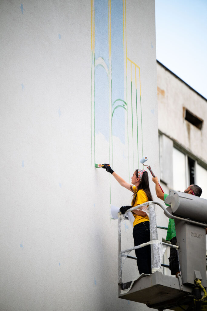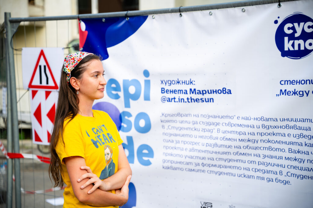 Днешната ни гостенка се определя като търсещ човек, а ние можем да допълним, че е и невероятно талантлива млада художничка. Най-новата творба, по която работи е част от инициативата „Кръговрат на познанието“ на фондация Visionary, за която ви разказахме миналата седмица. В рамките на проекта Венета Маринова изпълнява своя първи мащабен стенопис в градска среда („Студентски град“ в София), наречен „Между страниците“. С художествената идея за него Венета спечели конкурс, проведен сред студентите от специалност „Стенопис“ по-рано тази година. „Между страниците“ е разработен в стил Ар нуво и деликатно поставя книгата в центъра на композицията.