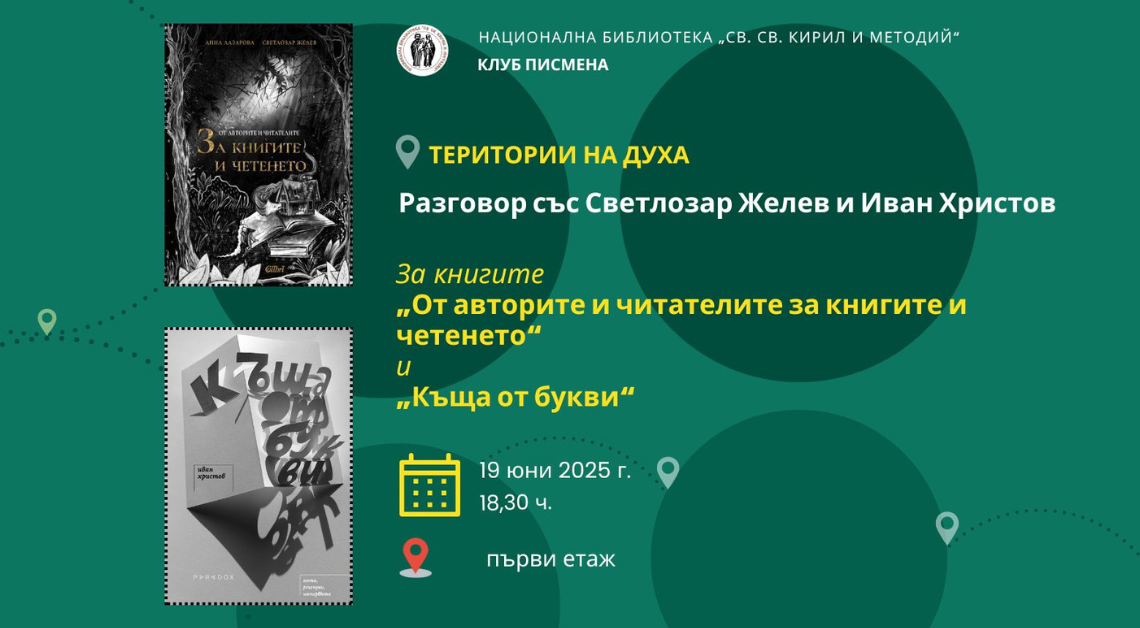 Клуб „Писмена“ на Националната библиотека „Св. св. Кирил и Методий“ ще посрещне Светлозар Желев и Иван Христов за вдъхновяващ разговор за книгите, четенето и местата, които ги съхраняват. Поводът са две скорошни издания – „Къща от букви“ от Иван Христов и „От авторите и читателите за книгите и четенето“, съставена от Анна Лазарова и Светлозар Желев. Срещата ще се състои на 19 юни от 18:30 ч.