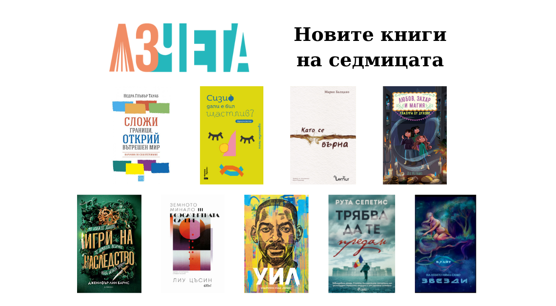 Веднъж в седмицата „Аз чета“ ви представя новите книги на пазара, подбрани от самите издателства. Следете нашия специален формат, но продължавайте да четете и ревютата, които правим за вас. Защото искаме да обичате книгите още повече!