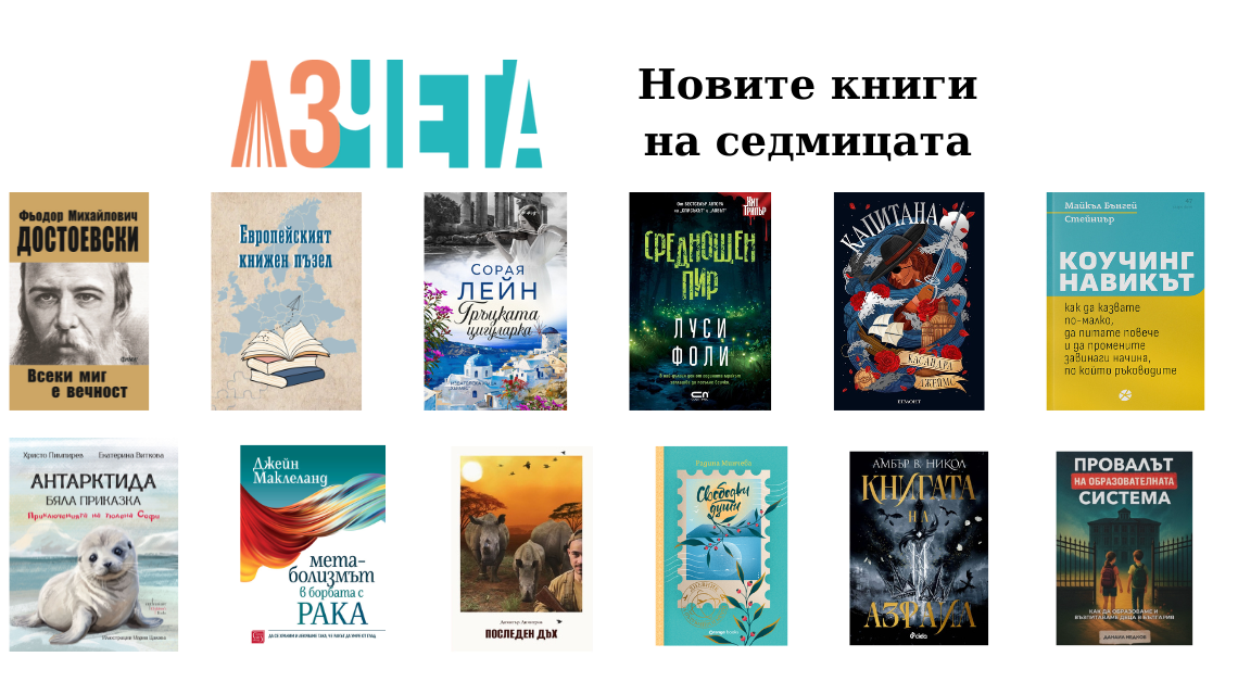 Ако искате да включим и ваша книга в седмичния ни подбор на нови заглавия, пишете ни на [email protected] поне няколко дни преди излизането ѝ на пазара, следвайки ползвания в този материал формат.
