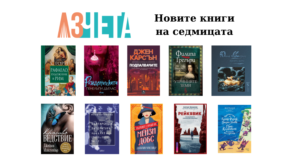 Ако искате да включим и ваша книга в седмичния ни подбор на нови заглавия, пишете ни на [email protected] поне няколко дни преди излизането ѝ на пазара, следвайки ползвания в този материал формат.