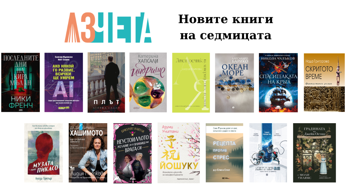 Ако искате да включим и ваша книга в седмичния ни подбор на нови заглавия, пишете ни на [email protected] поне няколко дни преди излизането ѝ на пазара, следвайки ползвания в този материал формат.