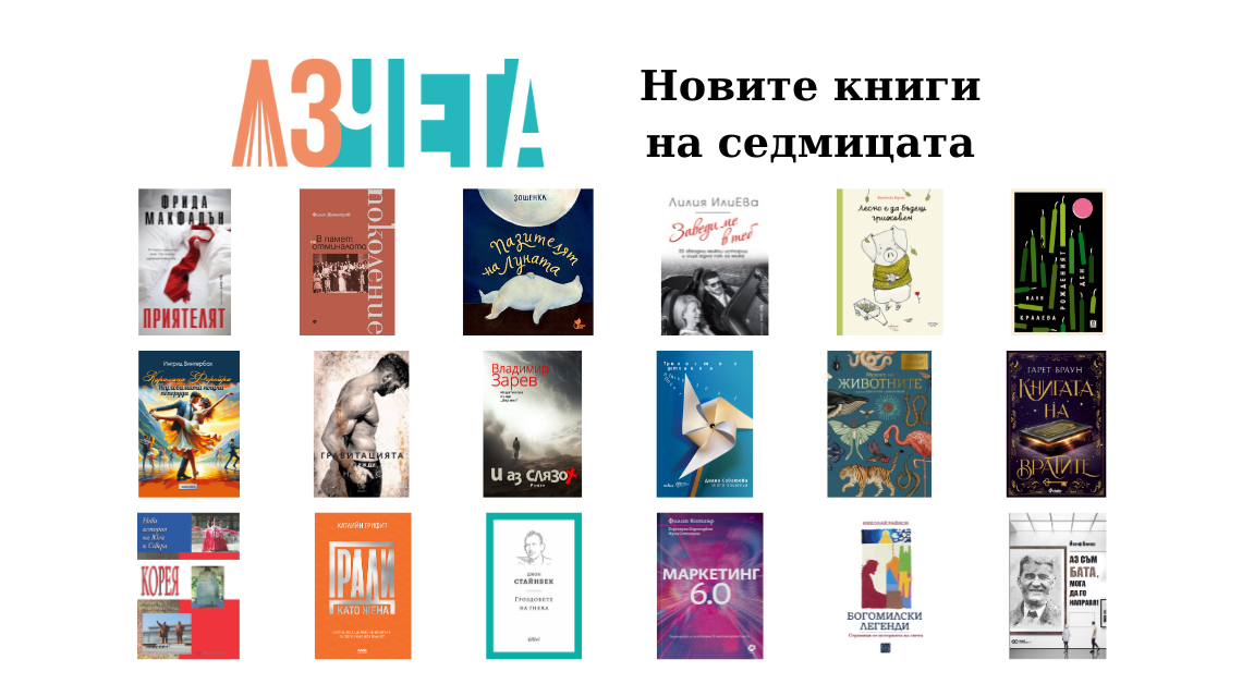 Ако искате да включим и ваша книга в седмичния ни подбор на нови заглавия, пишете ни на [email protected] поне няколко дни преди излизането ѝ на пазара, следвайки ползвания в този материал формат.