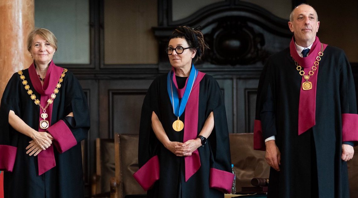 Полската писателка Олга Токарчук е в София и това се превърна в истински празник за ценителите на литературата. Вчера тя бе удостоена с почетното звание “Доктор хонорис кауза” на Софийския университет “Св. Климент Охридски”. Доц. Бойко Пенчев, декан на Факултета по славянски филологии, откри събитието, а високото отличие бе връчено от проф. Мария Стойчева, функционален ректор на университета. Речта си Токарчук започна с откъс от новия ѝ роман „Empuzjon“, а след това се обърна към гостите в препълнената аула. Предлагаме ви да прочетете речта на нобелистката в превод на Крум Крумов, както и да разгледате снимки от тържествената церемония на фотографката Яна Лозева.